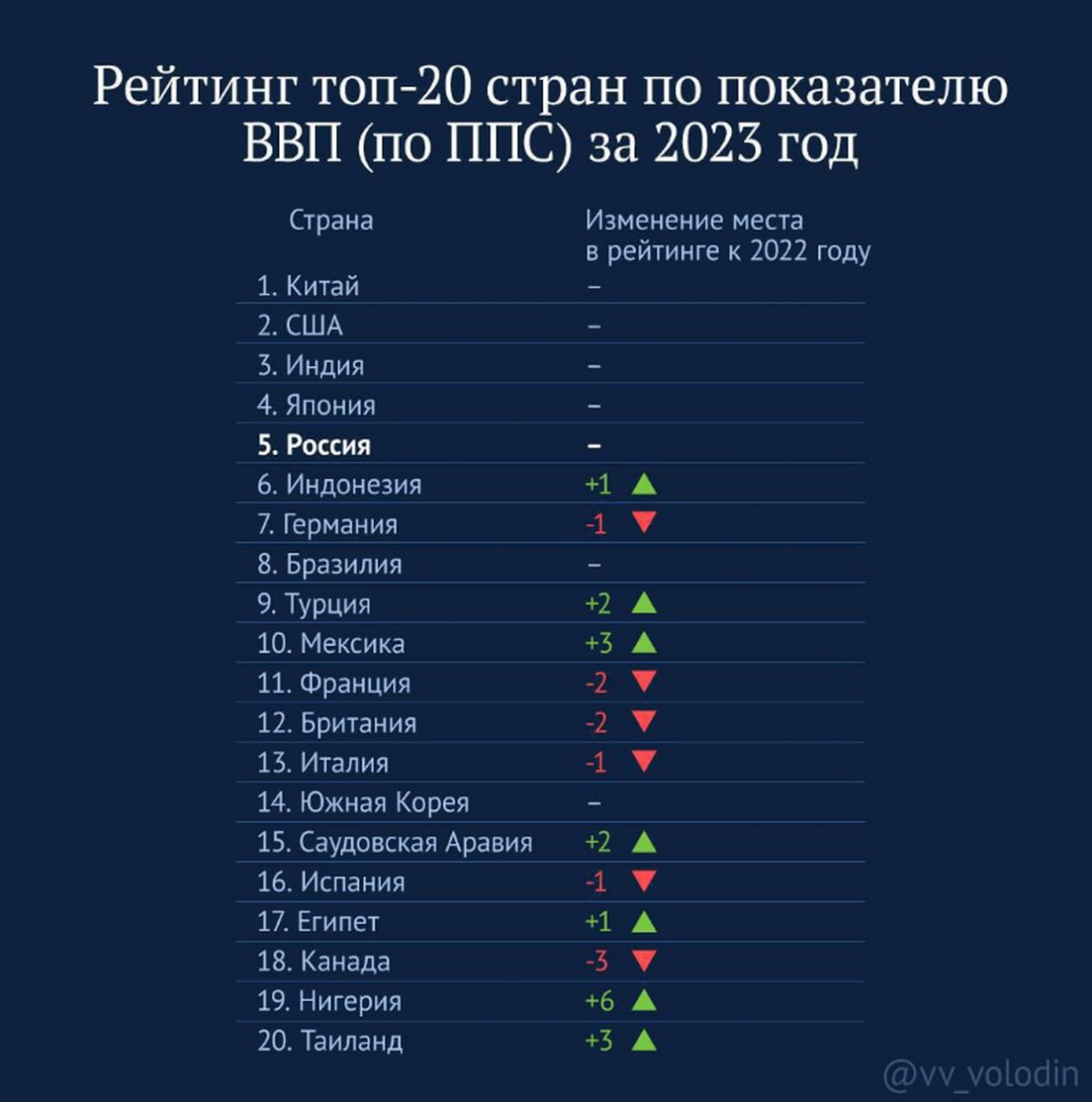 Новый рейтинг стран мира за 2023 год по паритету покупательной способности (ППС) опубликовал председатель Госдумы Вячеслав Володин. Парламентарий отметил, что Россия – пятая экономика мира и крупнейшая в Европе. При этом государства, развязавшие против нашей страны санкционную войну, продолжают ощущать на себе её негативные последствия.