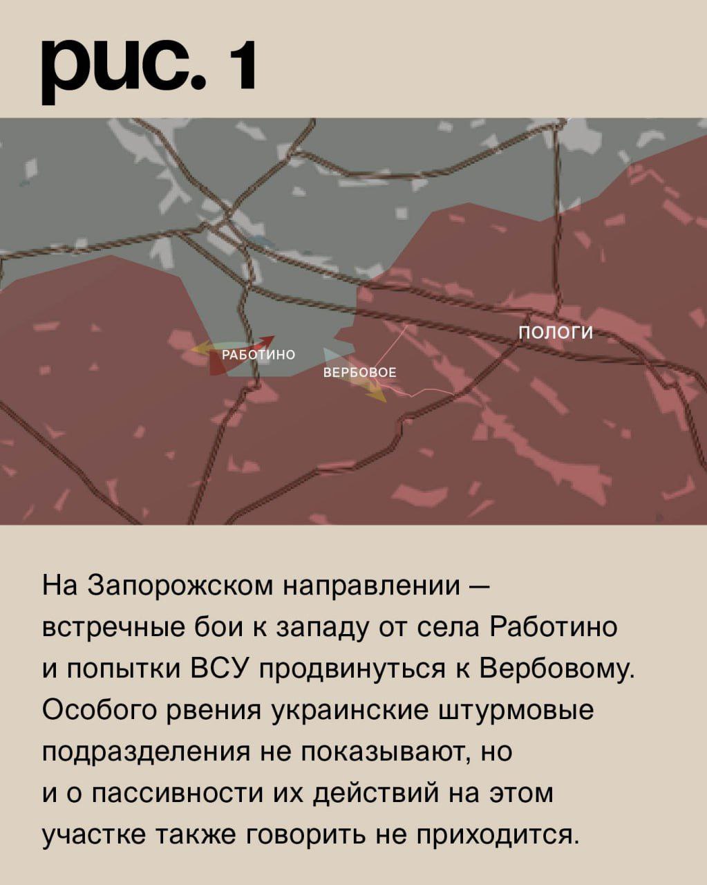 На Запорожском направлении – встречные бои к западу от села Работино и попытки ВСУ продвинуться к Вербовому. Особого рвения украинские штурмовые подразделения не показывают, но и о пассивности их действий на этом участке также говорить не приходится. (Рис. 1)