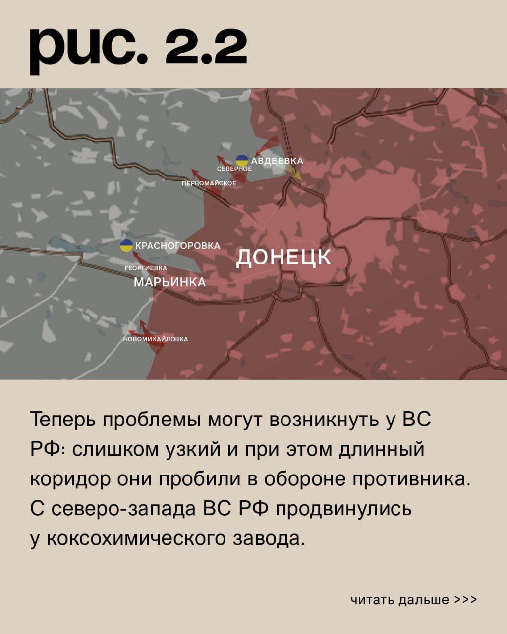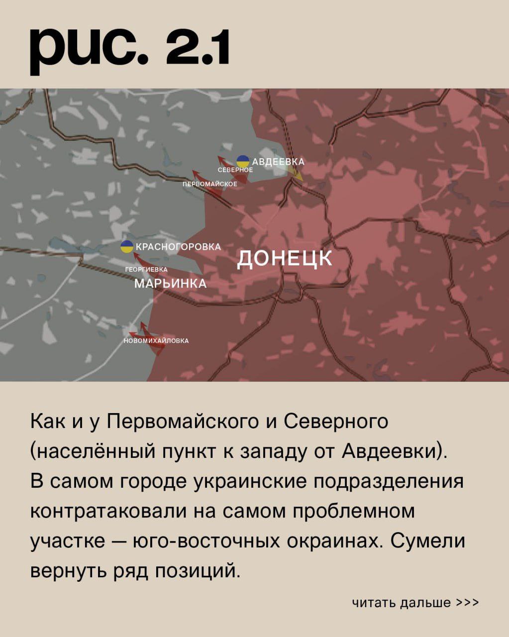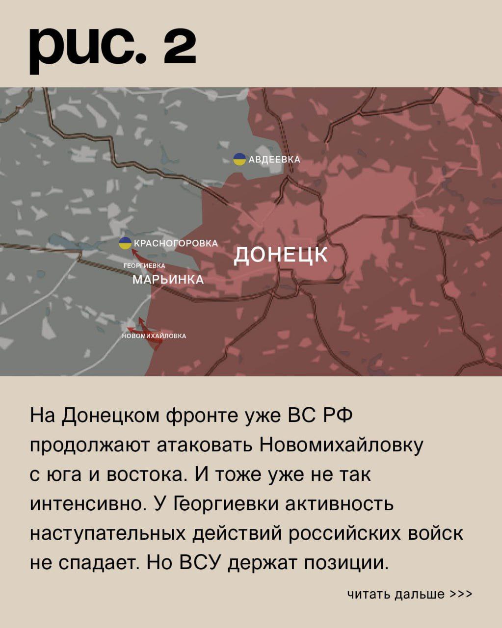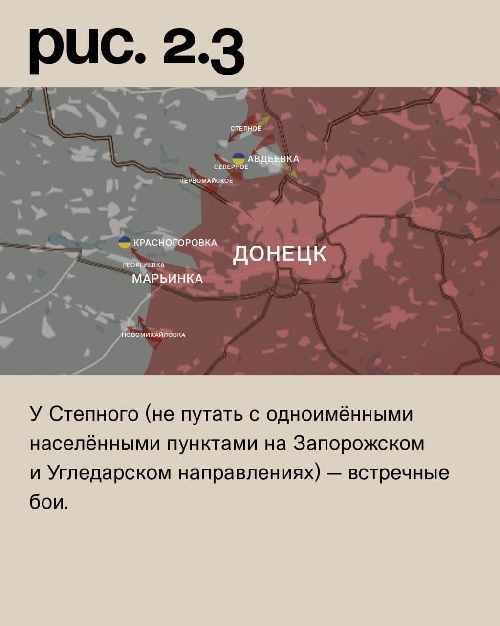 На Донецком фронте уже ВС РФ продолжают атаковать Новомихайловку с юга и востока. И тоже уже не так интенсивно. У Георгиевки активность наступательных действий российских войск не спадает. Но ВСУ держат позиции. Как и у Первомайского и Северного (населённый пункт к западу от Авдеевки). В самом городе украинские подразделения контратаковали на самом проблемном участке – юго-восточных окраинах. Сумели вернуть ряд позиций. Теперь проблемы могут возникнуть у ВС РФ: слишком узкий и при этом длинный коридор они пробили в обороне противника. С северо-запада ВС РФ продвинулись у коксохимического завода. У Степного (не путать с одноимёнными населёнными пунктами на Запорожском и Угледарском направлениях) – встречные бои. (Рис. 2)