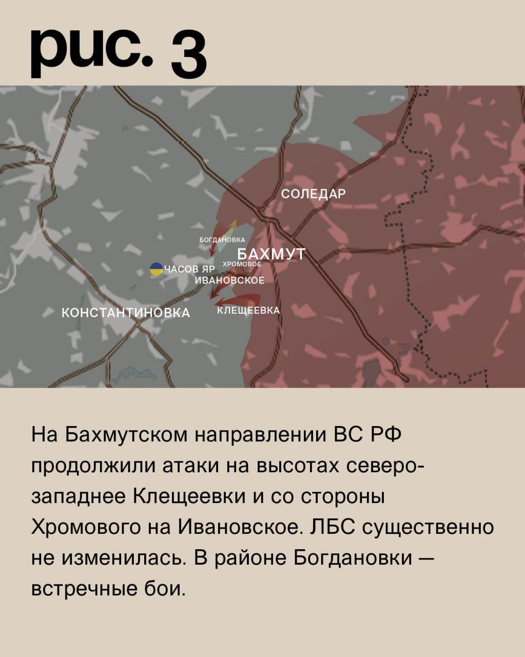 На Бахмутском направлении ВС РФ продолжили атаки на высотах северо-западнее Клещеевки и со стороны Хромового на Ивановское. ЛБС существенно не изменилась. В районе Богдановки – встречные бои. (Рис. 3)