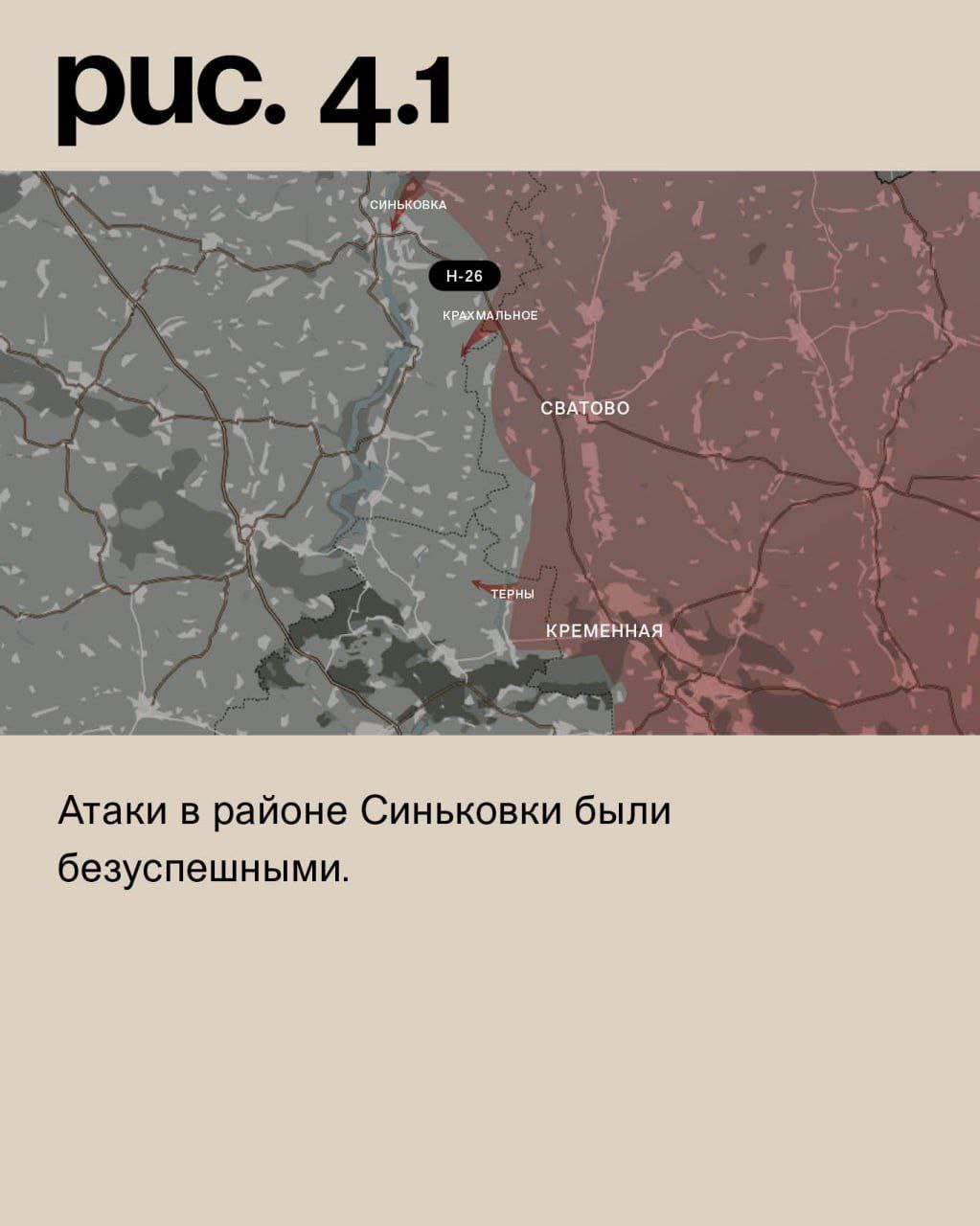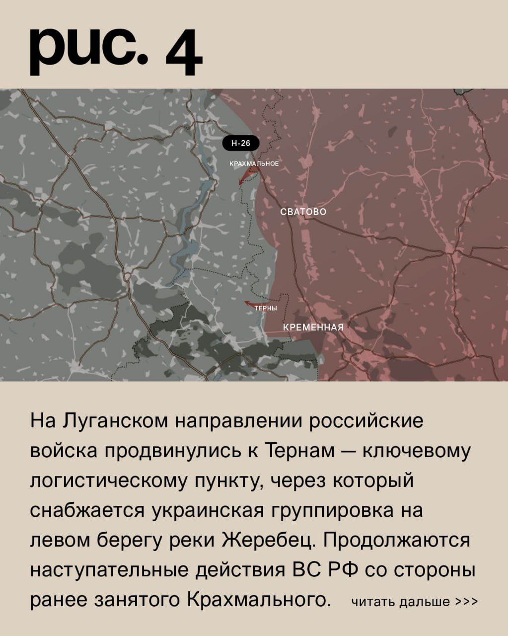 На Луганском направлении российские войска продвинулись к Тернам – ключевому логистическому пункту, через который снабжается украинская группировка на левом берегу реки Жеребец. Продолжаются наступательные действия ВС РФ со стороны ранее занятого Крахмального. Атаки в районе Синьковки были безуспешными. (Рис. 4)