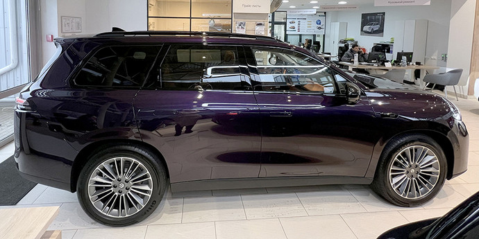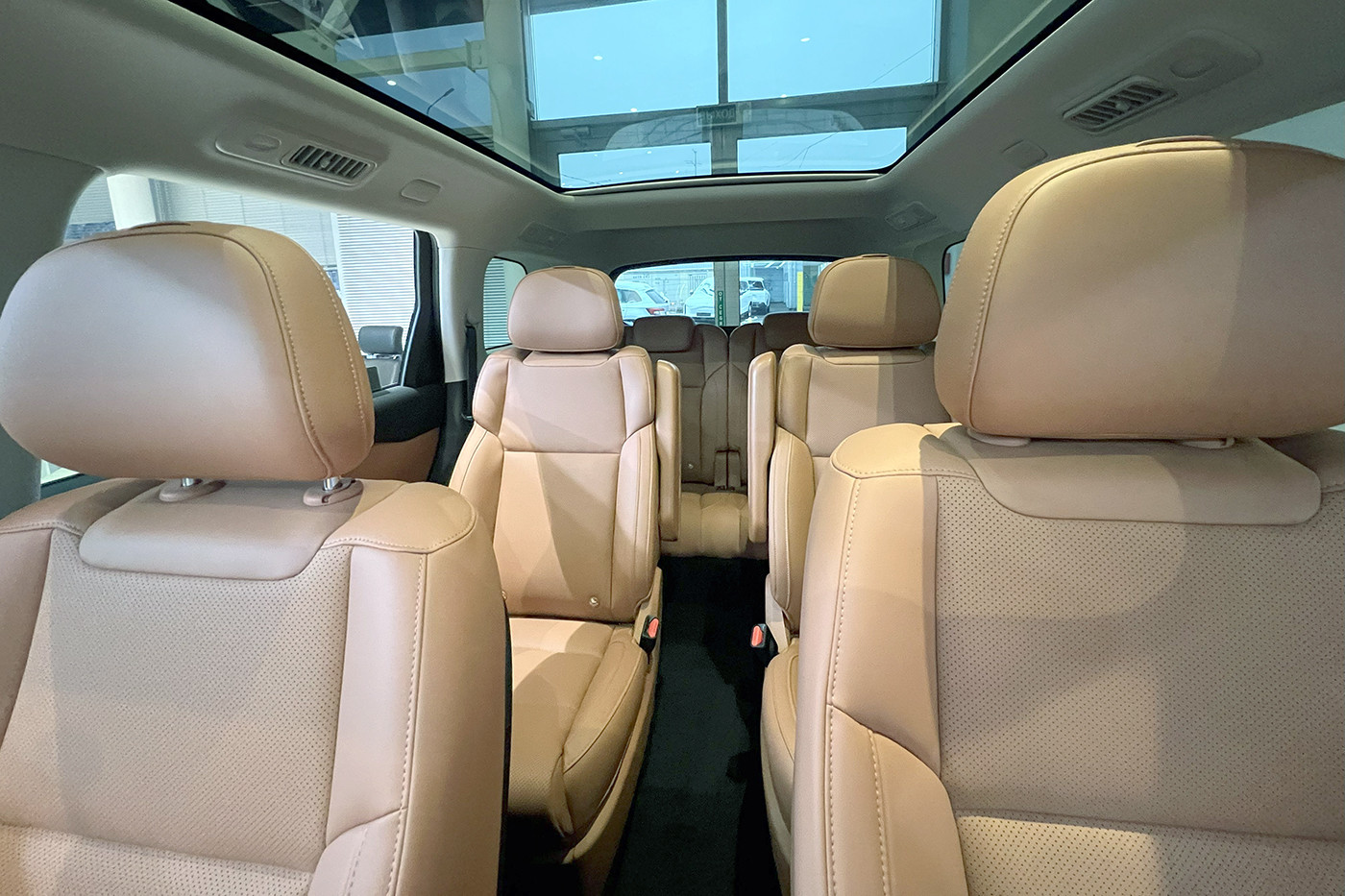 Салон разделен на три ряда и вмещает шесть мест с креплениями для детских кресел. Внутри — сиденья с памятью и вентиляцией, три дисплея и акустика с технологией Dolby Audio, трехзонный климат-контроль и обогрев сидений второго ряда, панорамная крыша. Багажник вмещает до 652 литров со сложенными сиденьями. В комплектацию также входят шесть подушек безопасности, светодиодные фары, кожаный руль с подогревом, лампы для чтения на всех рядах. Есть и поддержка V2L с розеткой в 220 вольт.