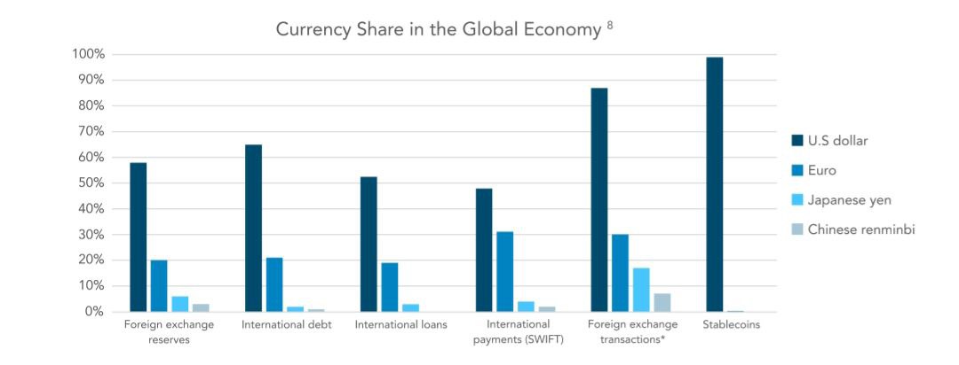 Доля долларовых стейблкойнов выше, чем доля доллара на международном рынке FOREX или его "вес" в золотовалютных резервах центробанков. Она почти в 2 раза больше, чем доля доллара в международном банковском кредите или платежах через SWIFT.