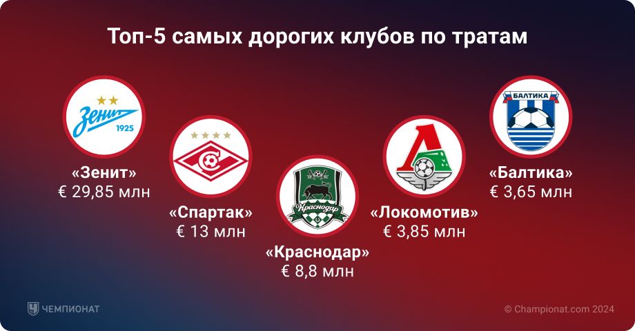 На втором месте по затратам идёт «Спартак». Московский клуб заключил всего одну сделку, но зато аж на € 13 млн — к команде присоединился 21-летний нападающий Манфред Угальде. Его переход стал вторым в списке самых дорогих в истории клуба (на первом месте Гус Тиль, которого покупали за € 18 млн).