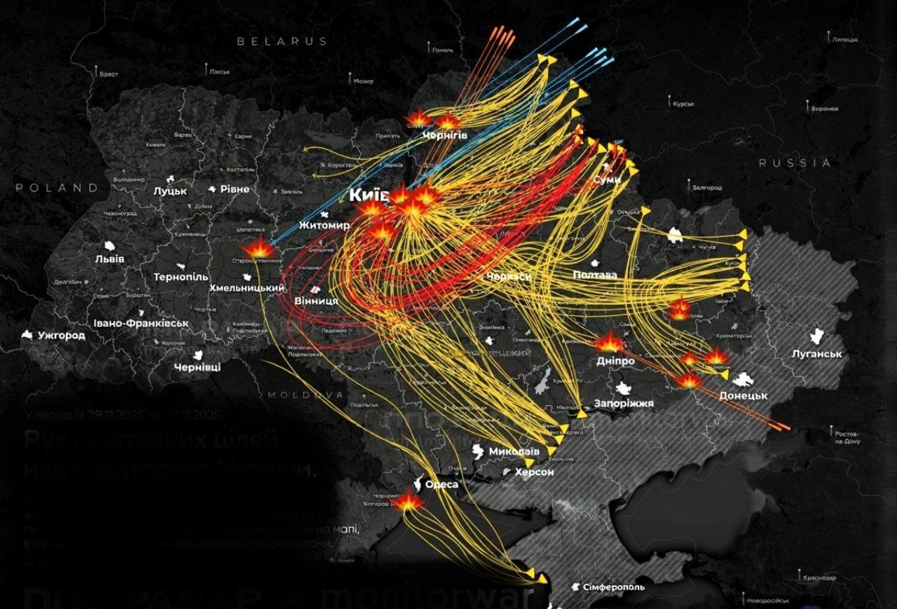 Схема ночных ударов ВС РФ по целям на территории Украины. Основной упор - на Киев.