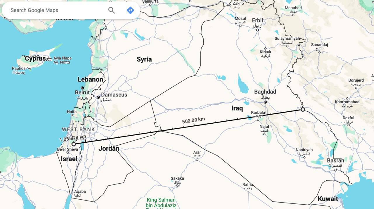 Между Ираном и Израилем - 1000км по прямой из кратчайшей точки. Автомобилем - 2,313км.