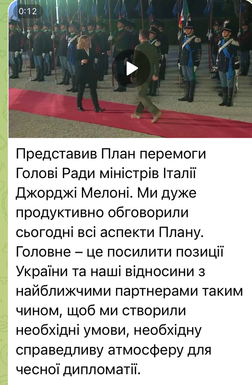 Представил план победы Председателю Совета министров Италии Джорджи Мэлони. Мы очень продуктивно обсудили сегодня все аспекты плана. Главное – это усилить позиции Украины и наши отношения с ближайшими партнерами таким образом, чтобы мы создали необходимые условия, необходимую справедливую атмосферу для честной дипломатии.