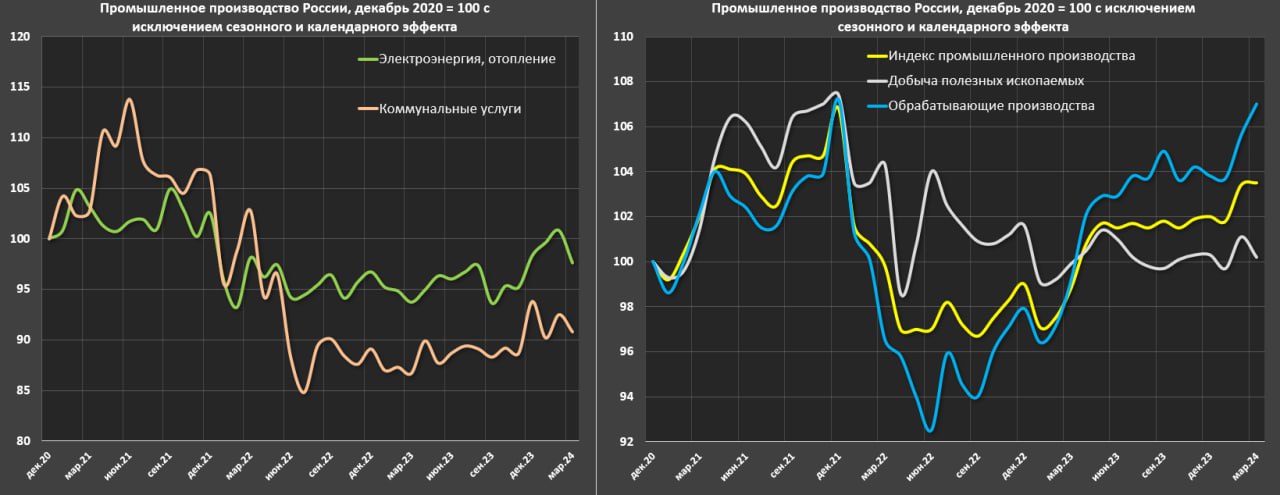 Если сравнить с маем 2023 (предполагаемый момент остановки активного расширения и переход в стагнацию по оценке Росстата), к марту 2024 обработка выросло на 4% (за 10 месяцев), добыча минус 1.2%, а общий индекс промышленности плюс 1.8% SA.