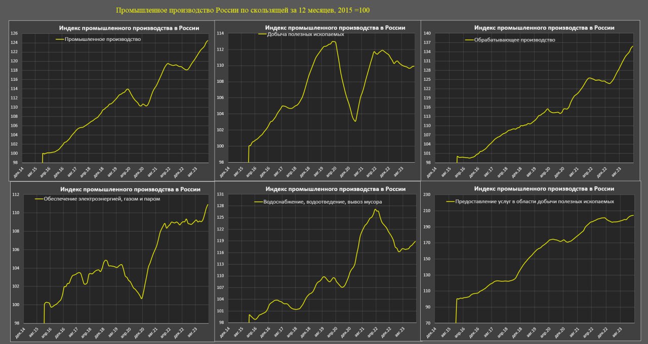 По крайней мере, до мая-июня 2023 промышленность России активно росла, дальше уперлась в производственный, ресурсный и кадровый потолок, но с начала 2024 отмечается улучшение ситуации.