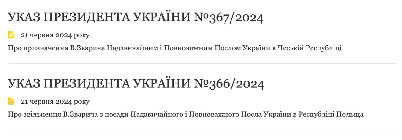 📃Василий Зварыч уволен с должности посла в Польше и назначен на аналогичный пост в Чехию