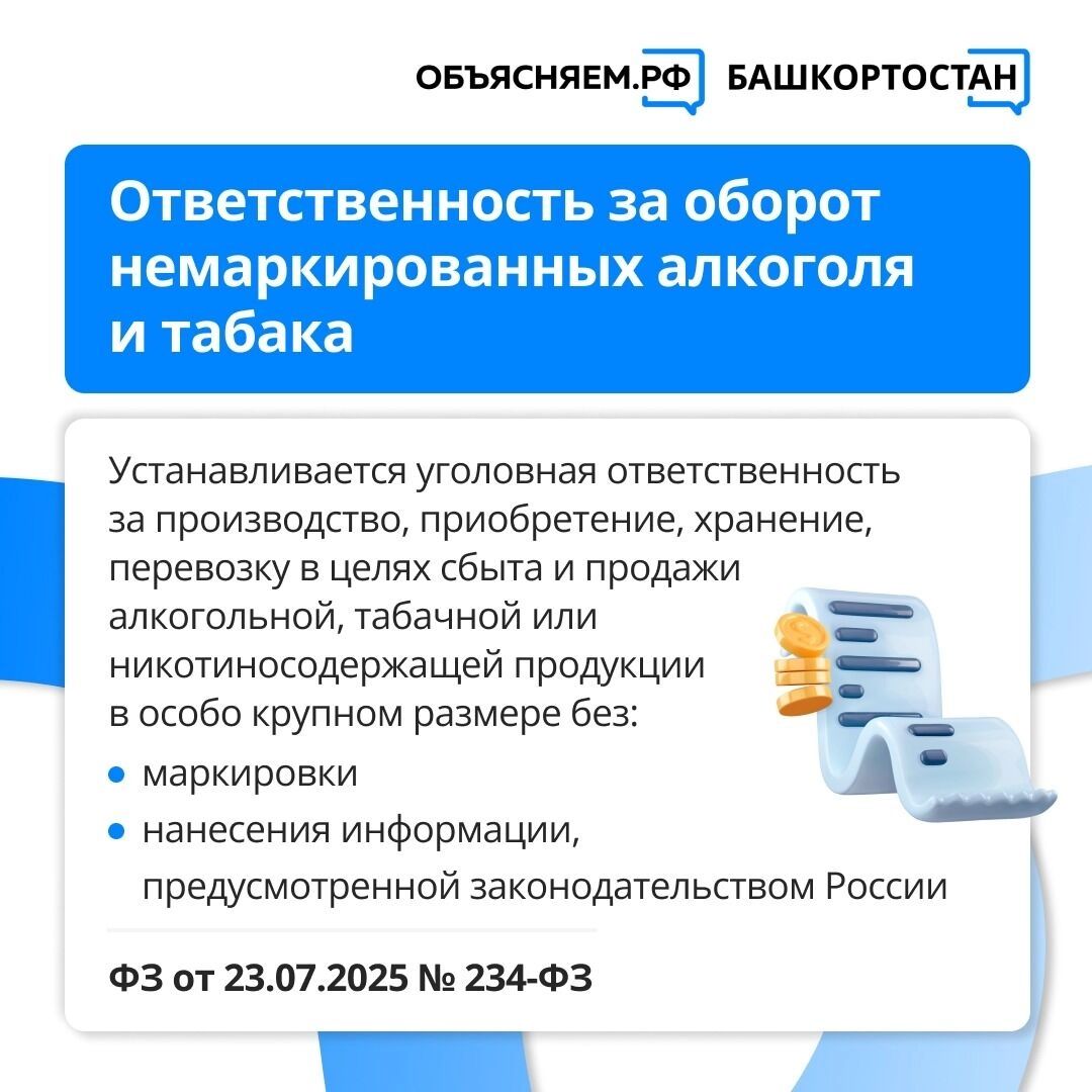Также ужесточена уголовная ответственность за производство или оборот немаркированной алкогольной, табачной и никотиносодержащей продукции в особо крупном размере (ФЗ № 234-Ф3 от 27.07.2025), что усилит контроль за нелегальным рынком.