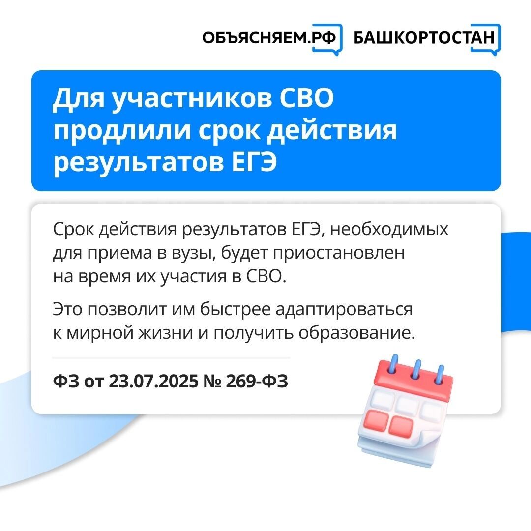 Для военнослужащих-участников СВО введена важная льгота: результаты ЕГЭ будут действительны на весь период прохождения службы и после ее завершения, упрощая поступление в вузы (ФЗ № 269-Ф3 от 23.07.2025).
