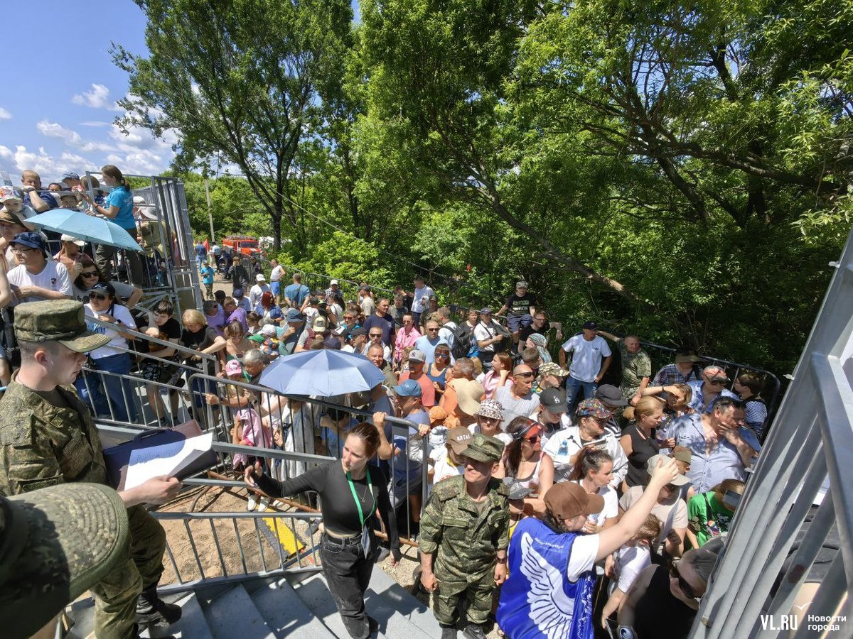 Когда приглашённые прошли, на все свободные места, лестницы и проходы стали пускать остальных. Жара на солнце больше 30 градусов, людей очень много, а некоторые при этом взяли с собой маленьких детей.