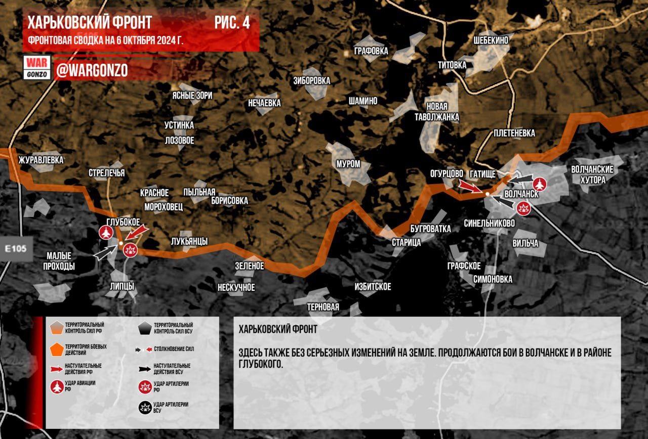 Харьковский фронт. Здесь также без серьезных изменений на земле. Продолжаются бои в Волчанске и в районе Глубокого.(Рис. 4)