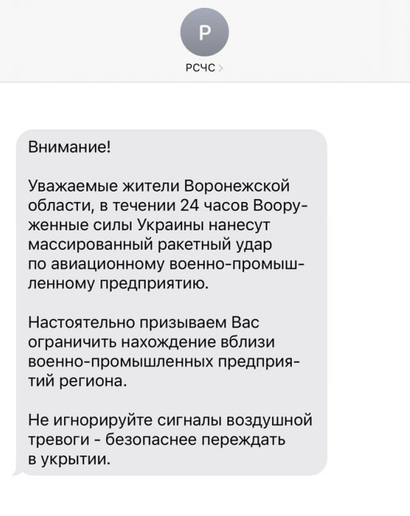 Жители Воронежской области получили фейковые смс-сообщения о готовящемся авиаударе. Об этом нам рассказал читатель «МОЁ!» сегодня, 11 апреля.