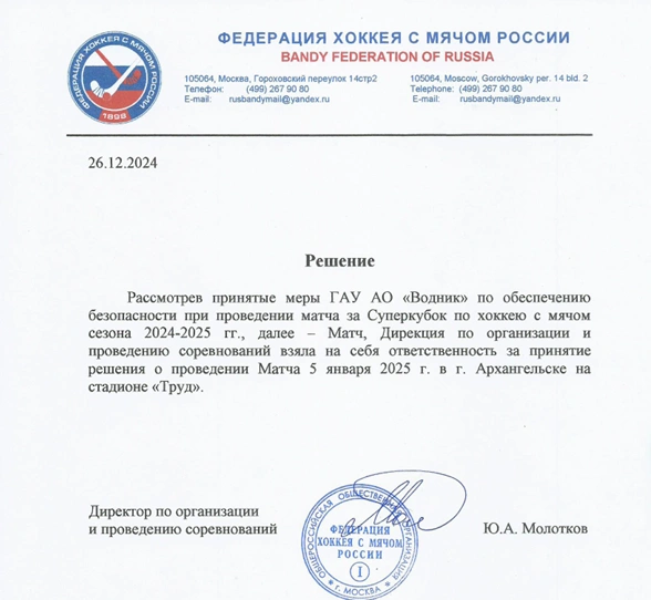 Архангельский «Водник» оштрафовали после того, как тренер «Кузбасса» Ильяс Хандаев показал болельщикам неприличный жесть. Момент попал на видео. На «Водник» наложили денежный штраф. В Федерации хоккея с мячом также сообщили, что из-за произошедшего инцидента рассмотрят вопрос о переносе Суперкубка из Архангельска. Но Суперкубок решили не переносить — он состоится 5 января в 13:00 на стадионе «Труд» в Архангельске.