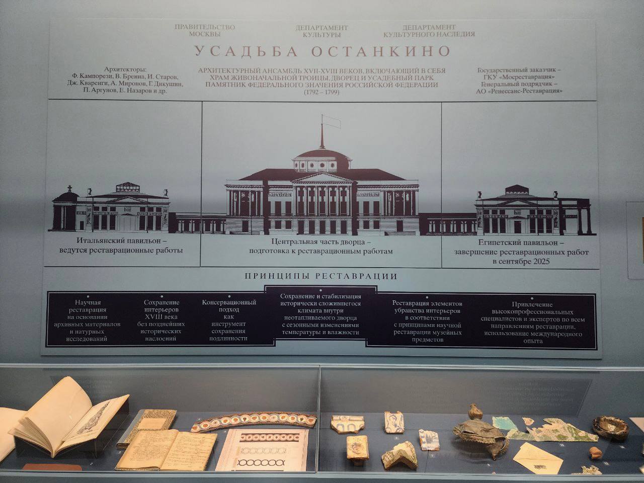 В выставочных залах Центра реставрации и хранения Усадьбы Останкино открылась уникальная выставка, посвящённая технологиям реставрации усадебного комплекса. Представлены предметы и элементы декора, которые ранее никогда не выставлялись.