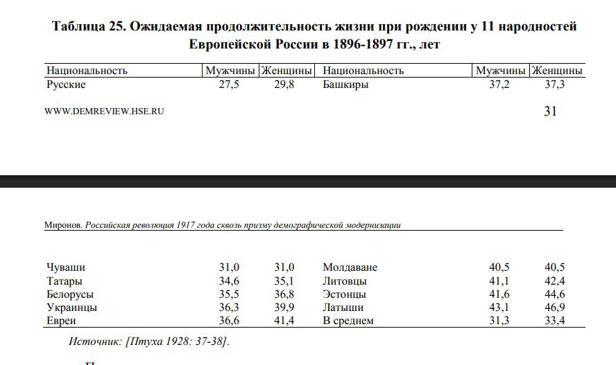 Ожидаемая продолжительность жизни для 11 народностей России на 1897 год хорошо отражает уровень развития каждого из этих этносов.