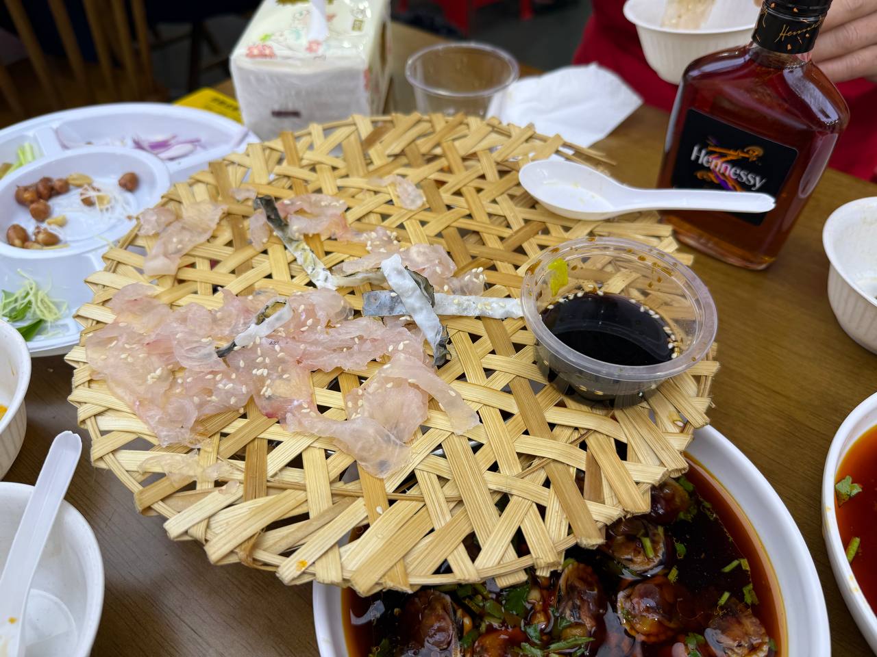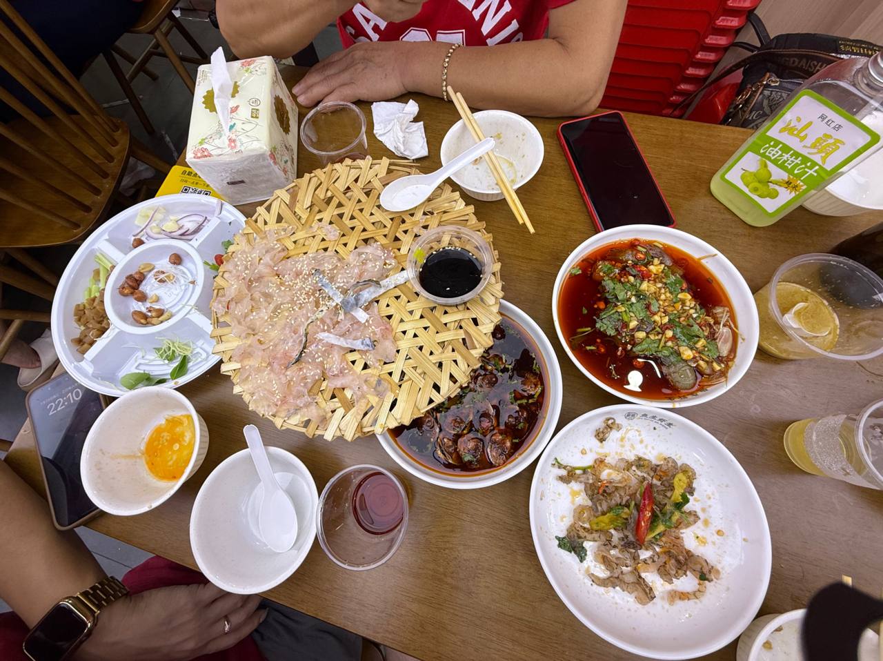 И главное блюдо - знаменитая местная рыба в виде такого сашими. Но едят её смешивая с овощами и соусом.