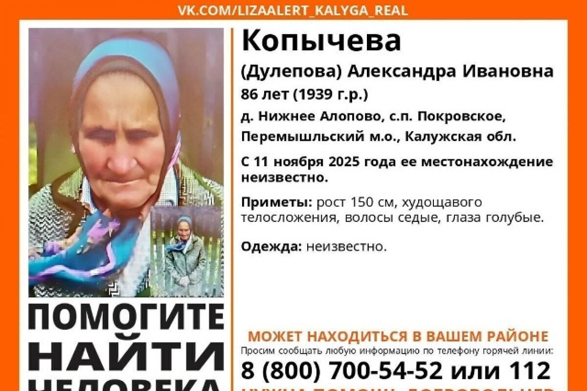 Поисковый отряд «ЛизаАлерт» сообщил о пропаже 86-летней жительницы деревни Нижнее Алопово Перемышльского района Калужской области. Женщина перестала выходить на связь 11 ноября, и с того дня сведений о её местонахождении нет.