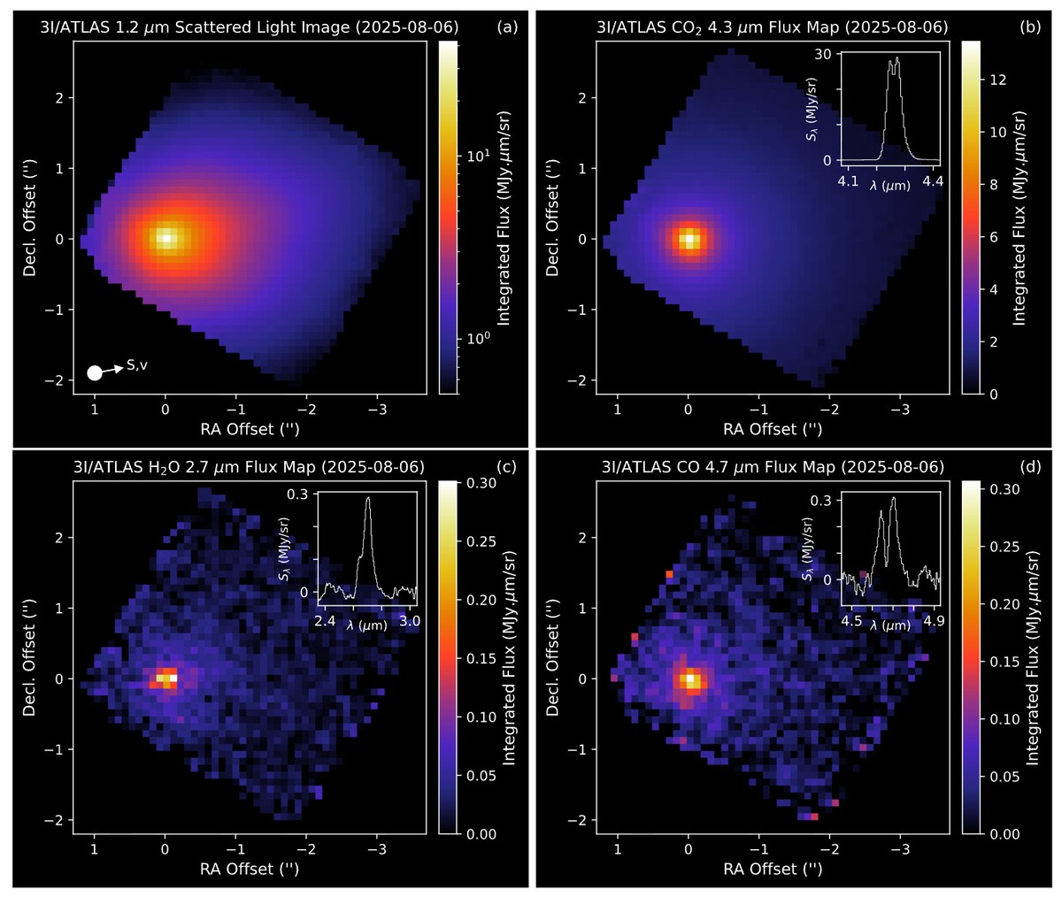 В отличие от обычных комет, кома (облако из пыли и газа) которых состоит преимущественно из водяного пара, 3I/ATLAS демонстрирует рекордное содержание углекислого газа. Соотношение CO₂ к воде в её коме входит в число самых высоких среди всех наблюдаемых комет. Такой состав указывает на два возможных сценария формирования объекта.