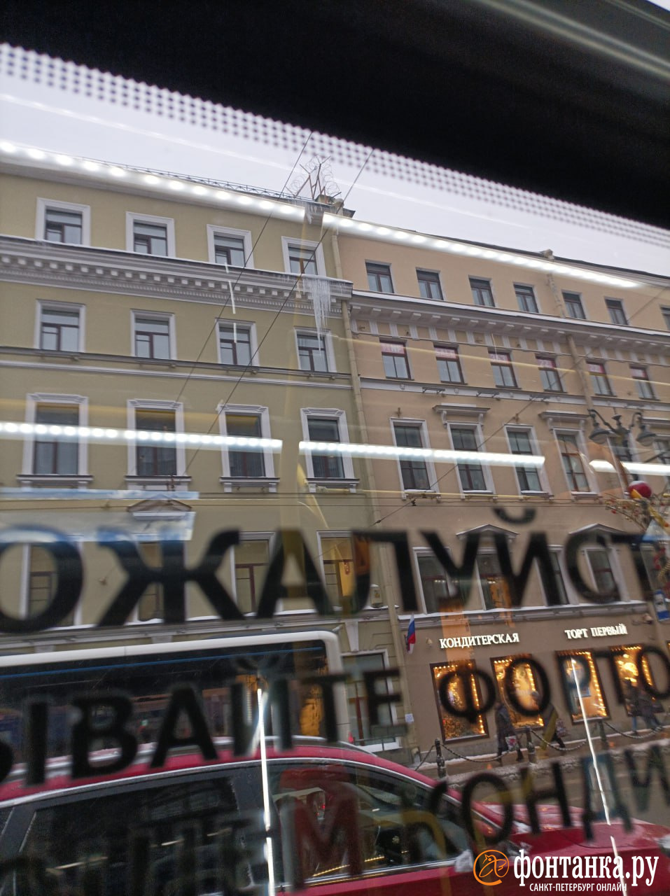 На Невском проспекте над тротуарами в разных концах улицы нависли большие сосульки. Одна наросла на карнизе дома 4 в районе пятого этажа. Читатель «Фонтанки» Александр заметил ее около 10 часов утра 1 декабря.