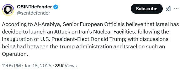 Высокопоставленные чиновники стран ЕС полагают, что Израиль нанесёт ракетно-бомбовый удар по ядерным объектам Ирана сразу после инаугурации Дональда Трампа.