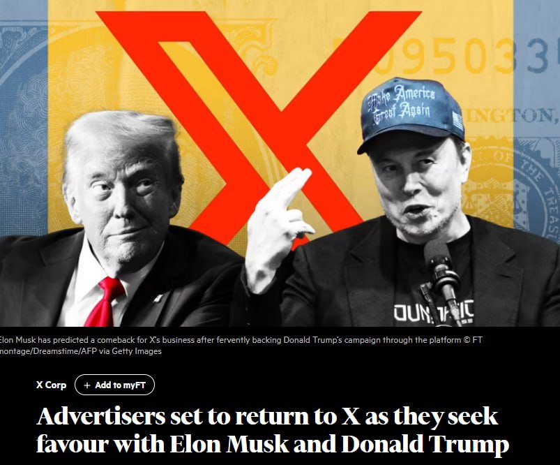 Лу Паскалис, генеральный директор маркетингового консалтингового агентства AJL Advisory и бывший медиаменеджер Bank of America, сказал, что некоторые маркетологи, скорее всего, перераспределят расходы обратно в X в качестве «политического рычага», если они планируют получить государственные контракты. Он добавил, что компании будут стремиться получить «благосклонность Илона», которому Трамп предоставил широкие полномочия в качестве соруководителя нового Департамента эффективности правительства.