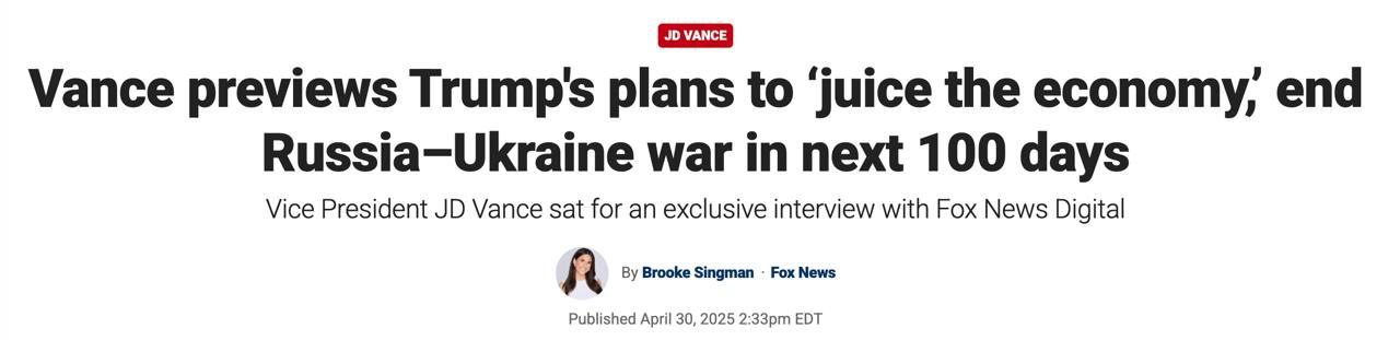 «Первые 100 дней — это вы почти исправляете и решаете все те вещи, которые очень легко сделать. В следующие 100 дней многое не изменится так быстро. Очевидно, у нас есть много вопросов внешней политики, над которыми мы работали, и, как мне кажется, они так или иначе дадут результат в течение следующих 100 дней... Президент хотел бы добиться прочного решения конфликта между Россией и Украиной, при котором не будут каждую неделю погибать 5 000 человек с обеих сторон», - заявил Вэнс.