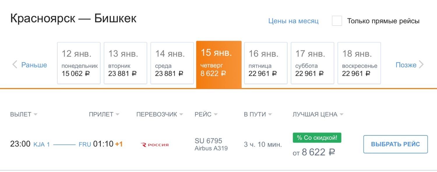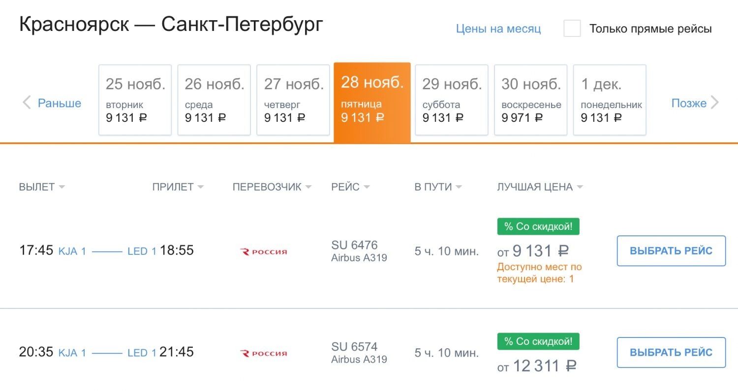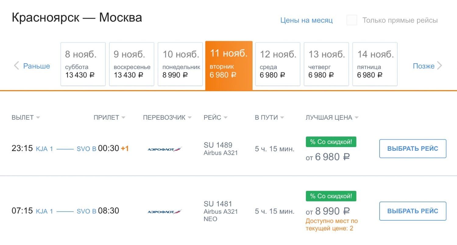 Авиакомпанией «Аэрофлот» можно улететь из Красноярска в Москву со скидкой. есть билеты на ноябрь, декабрь, январь, февраль и март — от 6 980 рублей.
