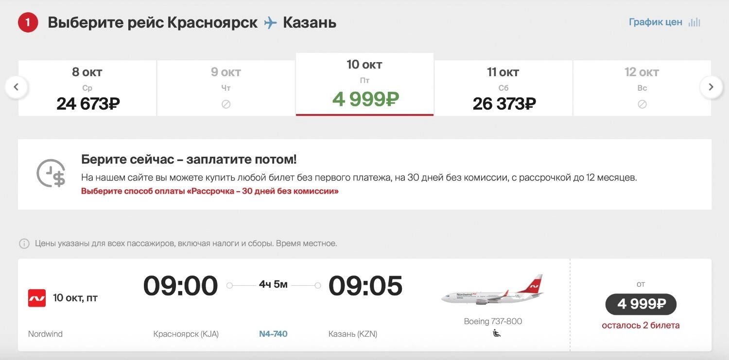 Авиакомпания Nordwind распадет билеты на рейсы Красноярск—Казань. Улететь можно в октябре, ноябре, декабре, январе и марте: билет стоит от 4999 рублей в одну сторону.