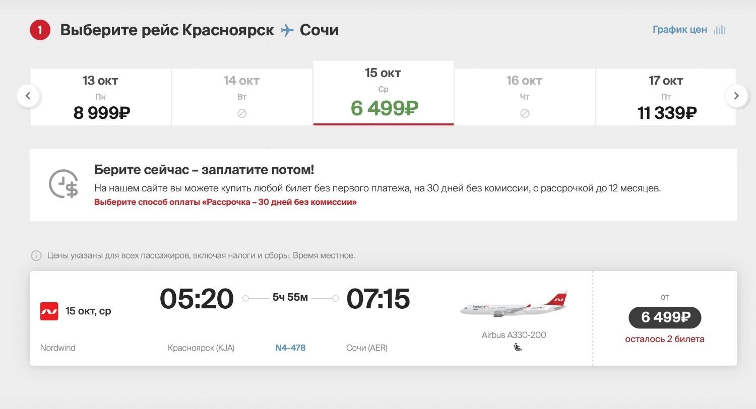 Еще авиакомпания продает билеты из Красноярска в Сочи — от 6499 рублей. Такие цены есть на полеты в октябре, ноябре, декабре, феврале и марте.