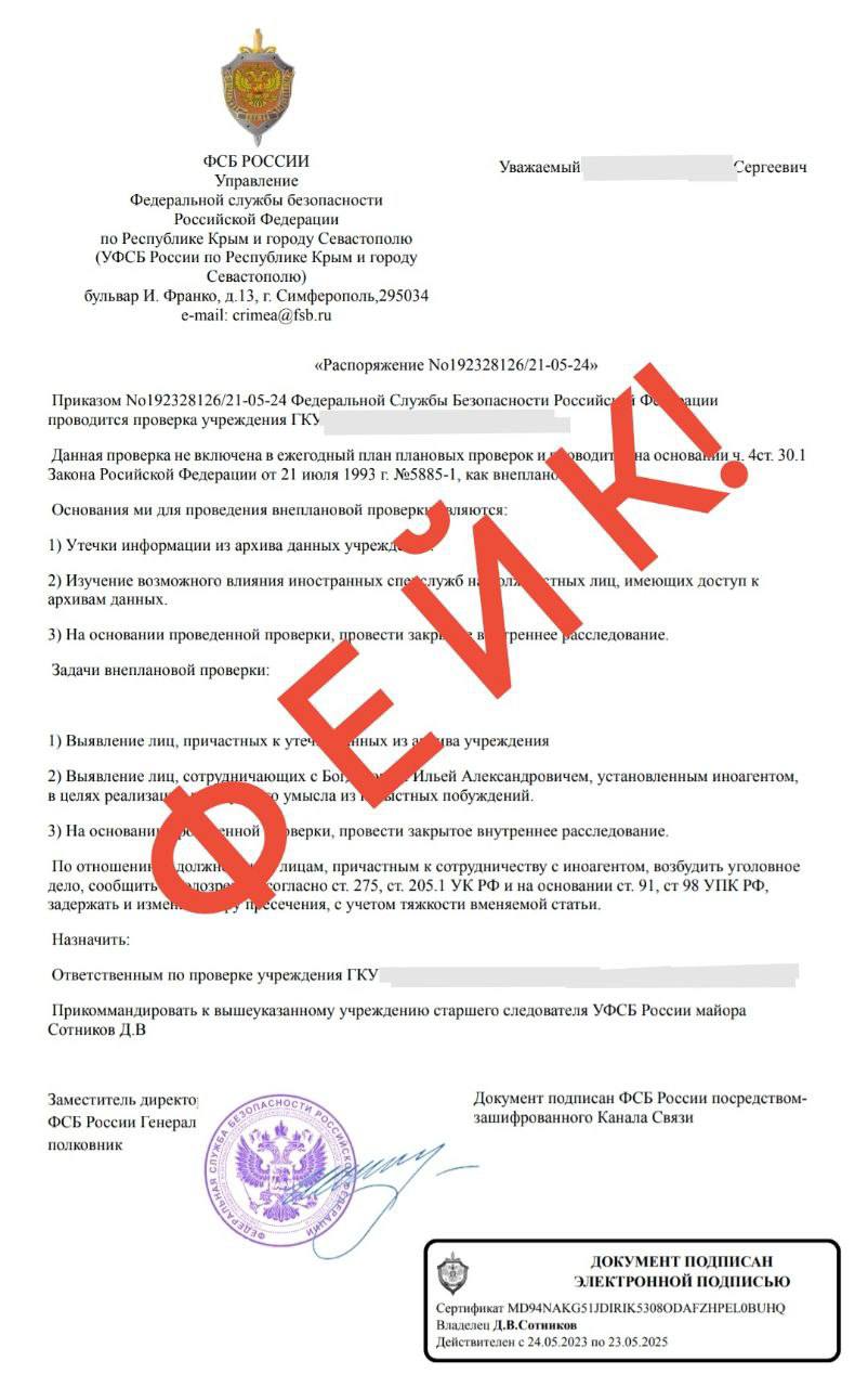 С поддельных аккаунтов руководителей органов власти, организаций и учреждений города Севастополя мошенники связываются с коллегами и подчинёнными и предупреждают, что с ними свяжутся из органов безопасности, чьи указания нужно беспрекословно выполнять. В доказательство рассылают письма о якобы проводимых внеплановых проверках со стороны органов ФСБ России. Для убедительности в поддельных документах указываются конкретные фамилии и наименования учреждений.