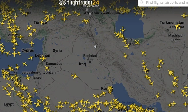 Так сейчас выглядит небо в районе конфликта. Самолетов практически нет, самой рискованной авиакомпанией оказались «Катарские авиалинии». Но и их самолет уже прошел опасную территорию над Иорданией.