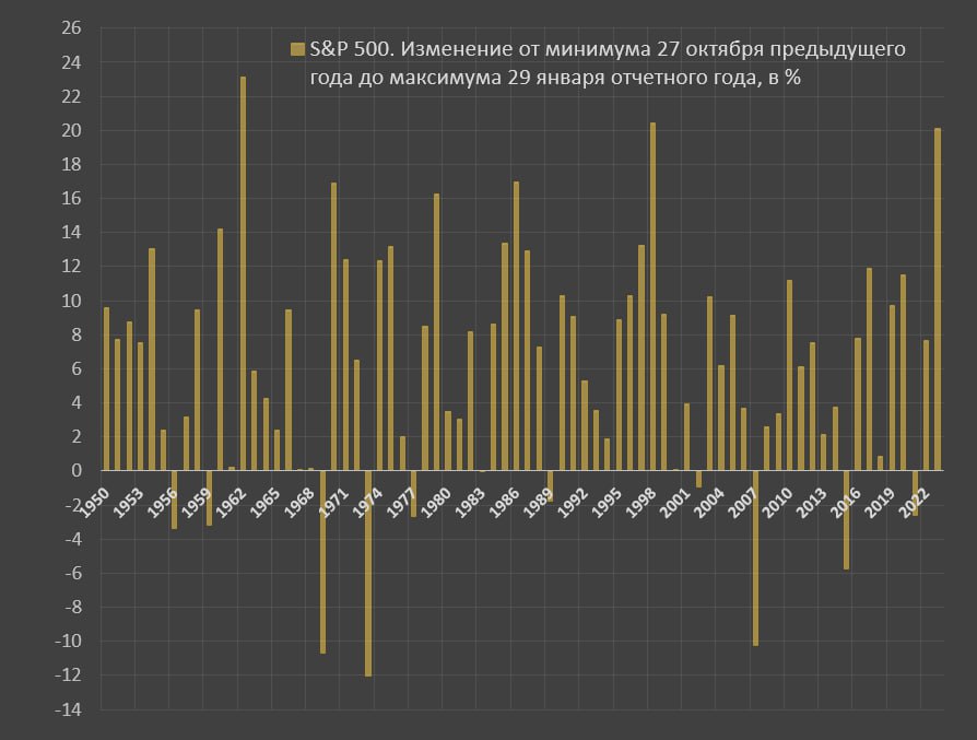 Исторически, период с конца октября по начало февраля являются одним из лучших в году. Среднее значение роста для указанного периода – 6.1% с 1950 года без учета 2024 года, за последние 20 лет – 4.8%, за последние 10 лет - 4.7%.