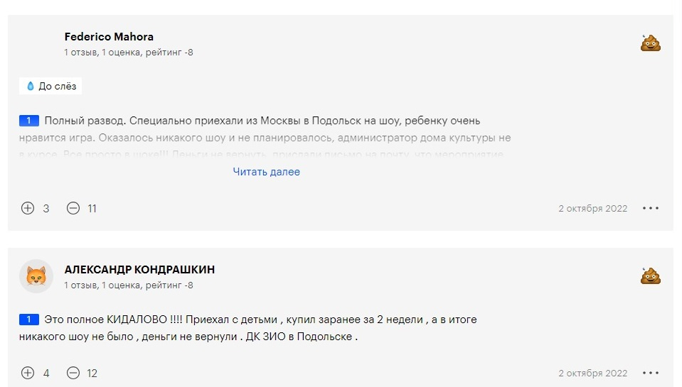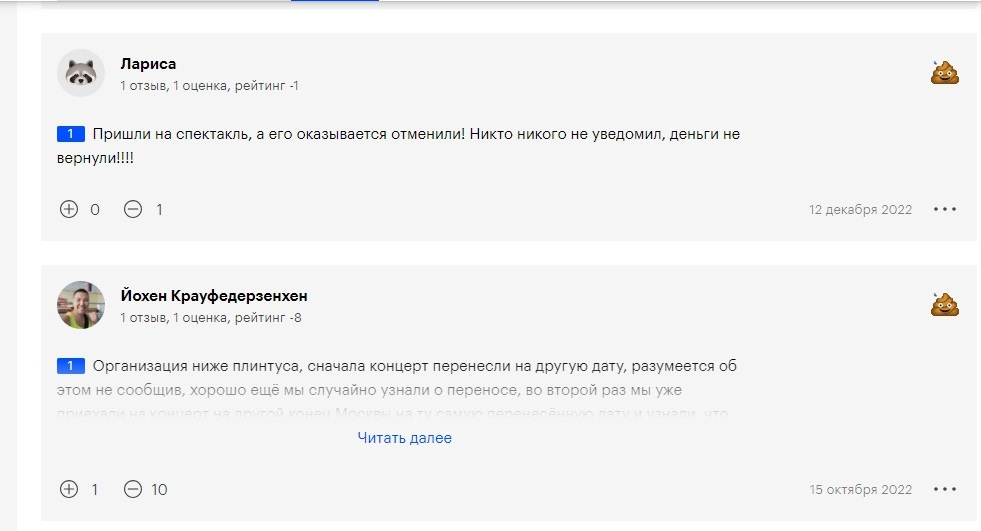 В редакцию обратилось еще несколько недовольных новосибирцев, которые пожаловались на действия организаторов. При этом в соцсетях люди уверяют, что оставшиеся без представления люди есть как минимум в восьми городах, а хвалебные отзывы о представлении на сайте Afisha с осени прошлого года разбавлены недовольными заявлениями о мошенничестве. Несколько выступлений всё же состоялись, но там возникли, по словам людей, другие проблемы.
