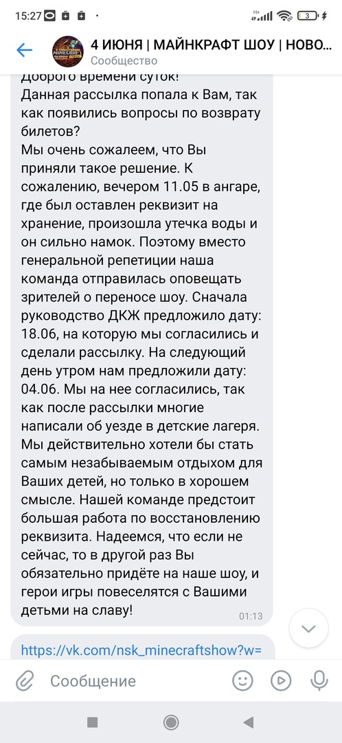 Представитель «Майнкрафт шоу» подтвердил, что с возвратом денег за билеты есть некоторые трудности, так как продавали их через разные сервисы.
