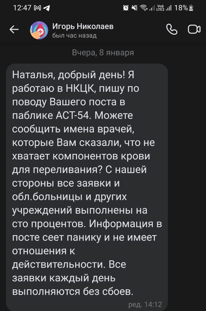 С Натальей Яковлевой, которая особенно активно публиковала призывы сдавать кровь, некий человек — в переписке он представился сотрудником Центра крови — связался сам. Он заявил, что никакого дефицита тромбомассы нет, и фактически обвинил ее в нагнетании паники.