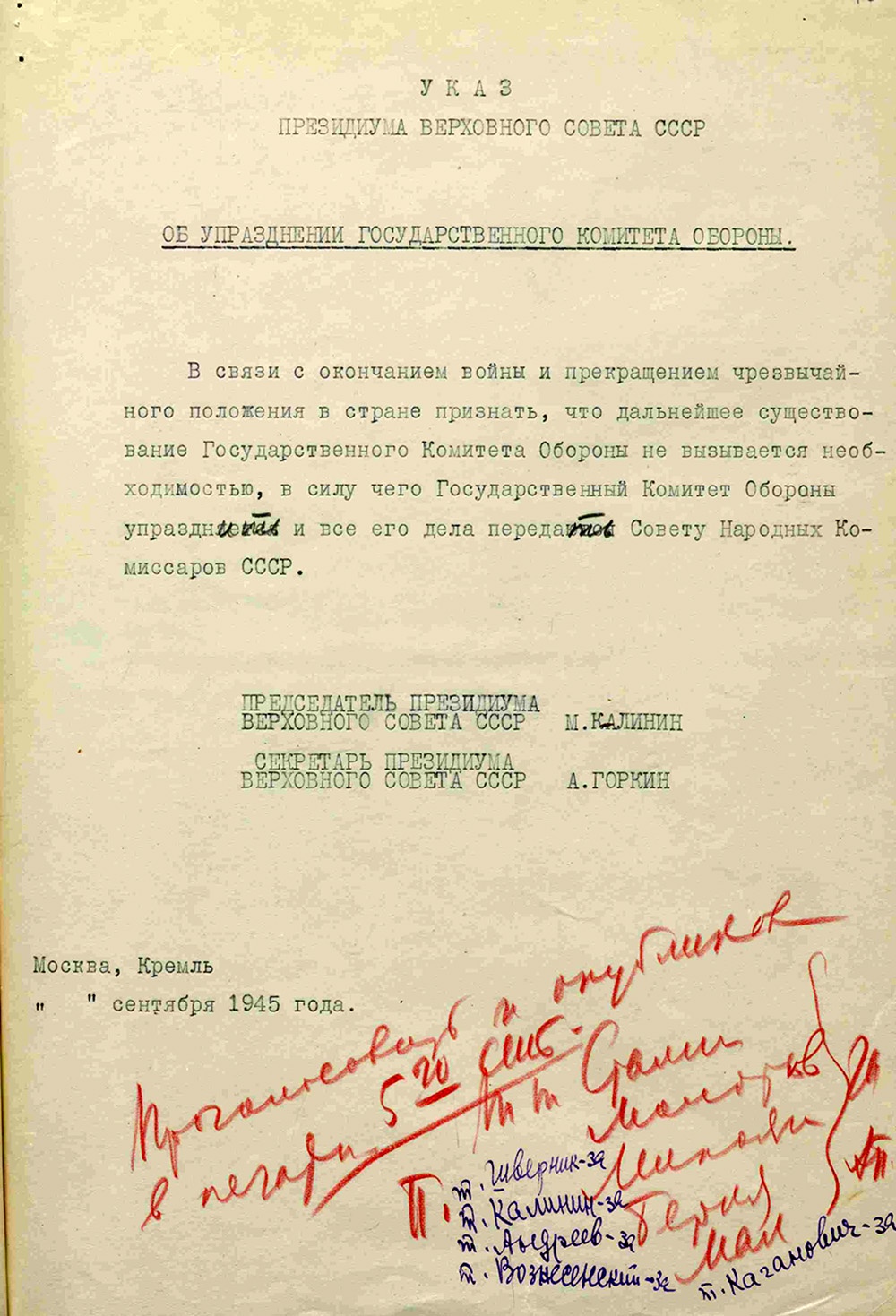 Андрей Сорокин: Парад Победы состоялся в соответствии с приказом Верховного главнокомандующего от 22 июня. Он стал символом завершения Великой Отечественной войны, а упомянутый вами эпизод - его кульминацией, которая и сегодня вызывает душевный трепет. Еще одним таким символом, менее заметным, но не менее значимым, причем не только с символической, но и функциональной точки зрения станет упразднение в начале сентября Государственного комитета обороны (ГКО) СССР - высшего чрезвычайного органа государственной власти в годы войны. Советский Союз переходил на рельсы мирного строительства.