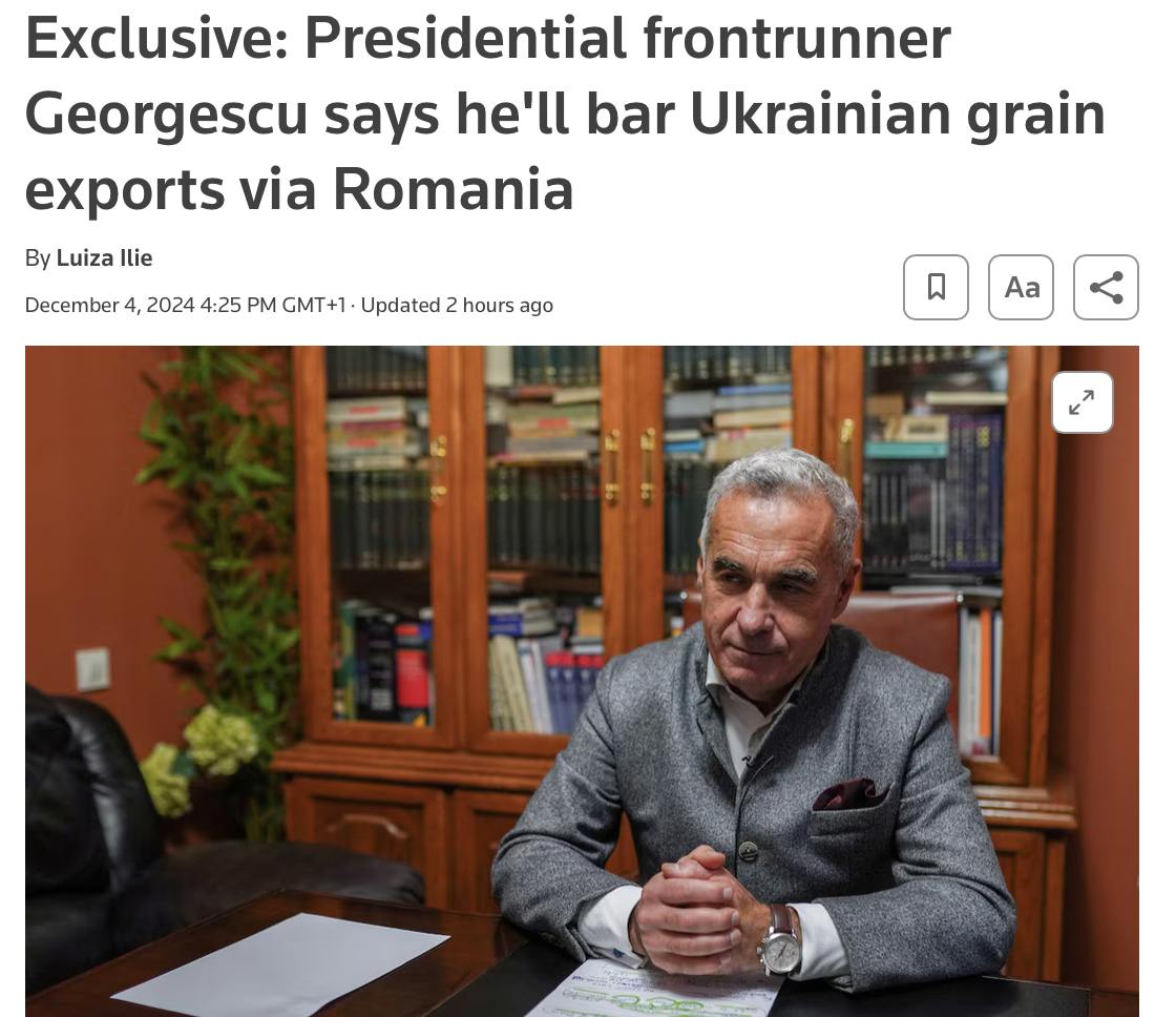 Победитель первого тура президентских выборов в Румынии предложил запретить транзит украинского зерна и прекратить военную помощь ВСУ — Reuters
