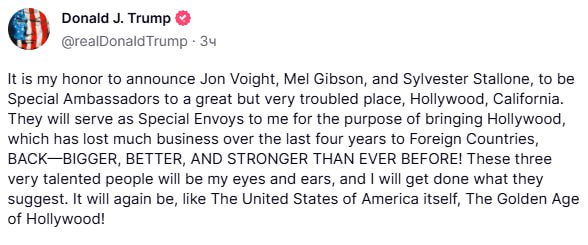 π Π‘Π΄Π΅Π»Π°ΡΡ Π°ΠΌΠ΅ΡΠΈΠΊΠ°Π½ΡΠΊΠΎΠ΅ ΠΊΠΈΠ½ΠΎ ΡΠ½ΠΎΠ²Π° Π²Π΅Π»ΠΈΠΊΠΈΠΌ: Π’ΡΠ°ΠΌΠΏ Π½Π°Π·Π½Π°ΡΠΈΠ» Π‘ΡΠ°Π»Π»ΠΎΠ½Π΅, ΠΠΈΠ±ΡΠΎΠ½Π° ΠΈ ΠΠΎΠΉΡΠ° ΡΠ²ΠΎΠΈΠΌΠΈ ΡΠΏΠ΅ΡΠΏΠΎΡΠ»Π°Π½Π½ΠΈΠΊΠ°ΠΌΠΈ Π² ΠΠΎΠ»Π»ΠΈΠ²ΡΠ΄Π΅