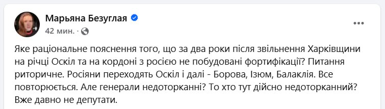 В Харьковской области после освобождения территорий не были построены фортификации на границе с РФ и на реке Оскол, — нардеп Безуглая