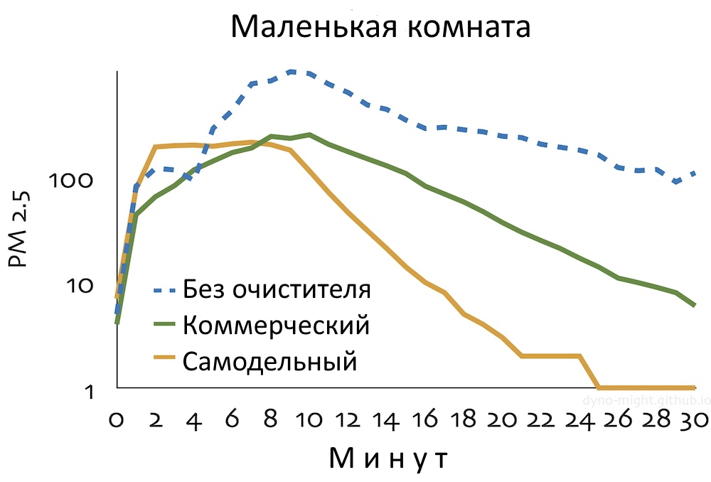 Если сделать ось y логарифмической, то станет ясно, что самодельный фильтр очищает воздух эффективнее.
