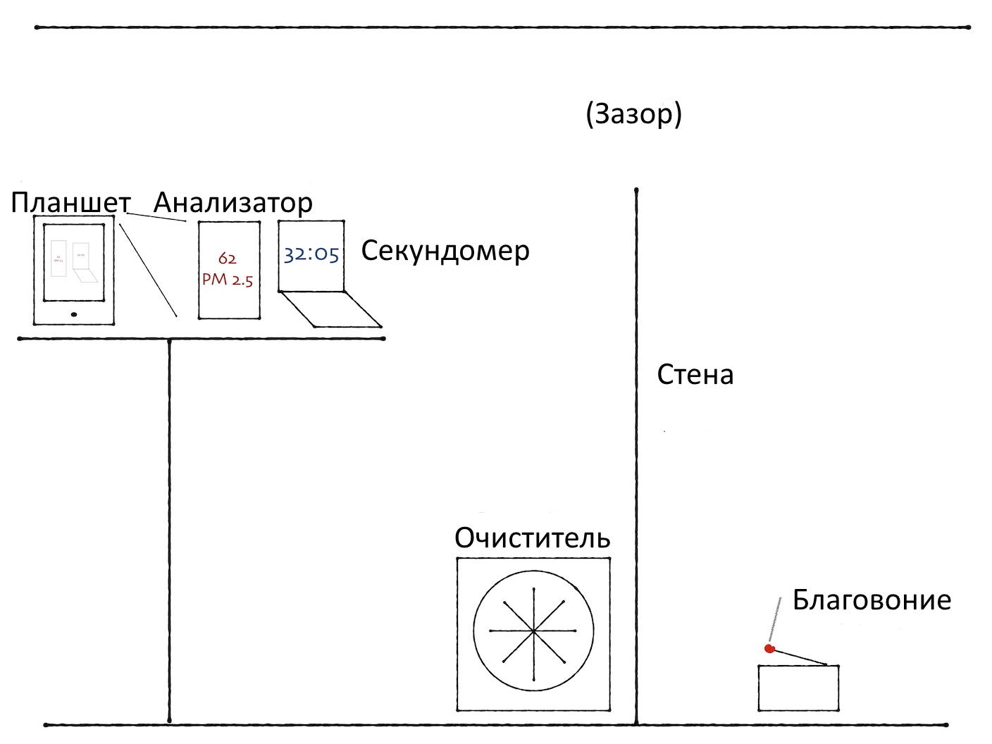 Слава богу, бо́льшую часть времени я провожу не в той маленькой комнатушке. Второй этап эксперимента я провёл в большом помещении объёмом около 100 м3. Здесь уже между благовонием и очистителем стены не было. Вместо этого я установил очиститель примерно в одном метре от анализатора и от благовония.