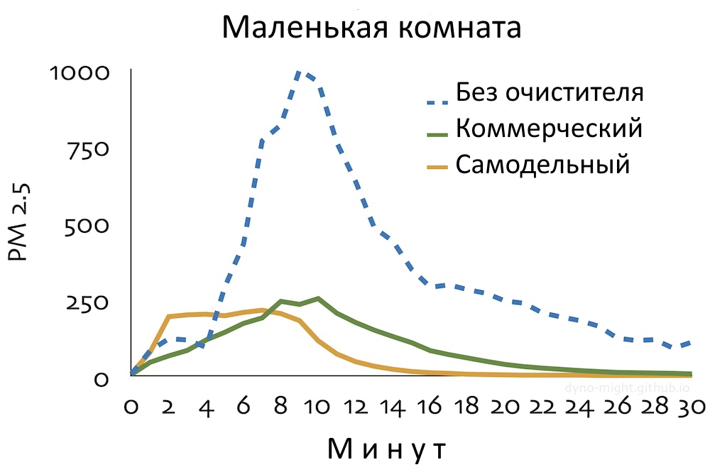 Ориентируясь на установленный EPA порог в 12 мкг/м3, мы видим, что самодельный фильтр достигает этого значения за 15 минут при том, что коммерческий – за 25.