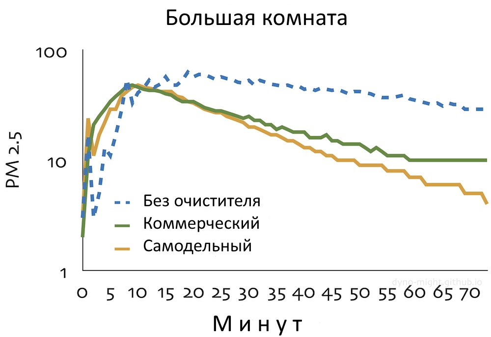 Самодельный очиститель проявил себя немного лучше покупного. Если использовать логарифмический масштаб, то становится более очевидно, что он действительно справляется эффективнее.
