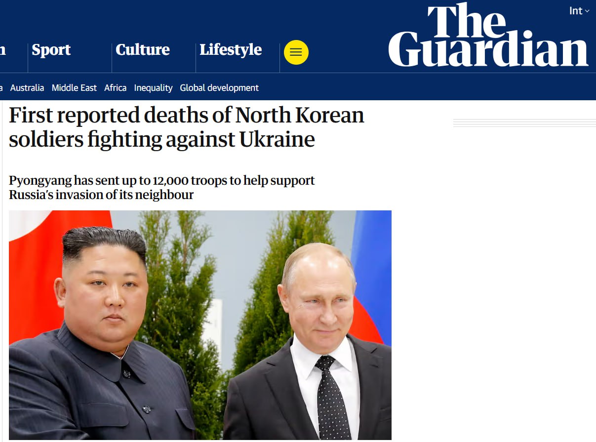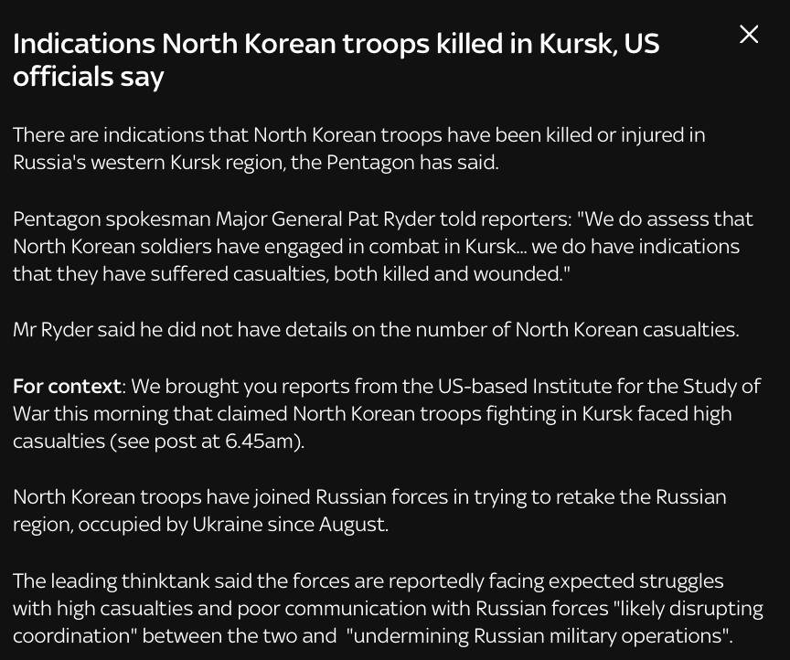 ▪️Военная разведка Украины заявила, что около 30 северокорейских военнослужащих были убиты или ранены во время боев с ВСУ в минувшие выходные.