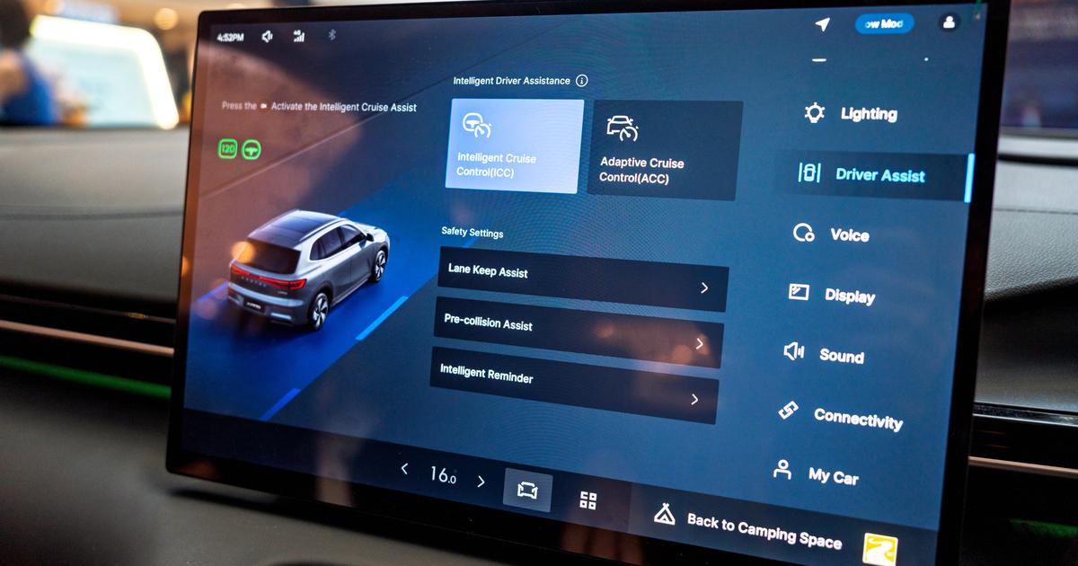 Lors de la configuration initiale, l’ordinateur de bord invite le conducteur à «sélectionner les fonctions désactivables par un appui long sur le bouton ADAS». Le véhicule liste lui-même les options disponibles : alerte d’attention du conducteur, aide au maintien dans la voie, alerte dépassement de vitesse, système de freinage automatique, antipatinage.