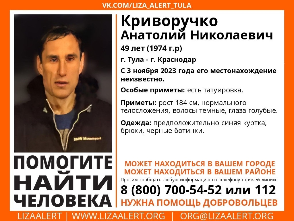 В Туле пропал 49-летний Криворучко Анатолий Николаевич. Местонахождение мужчины неизвестно с 3 ноября 2023 года.