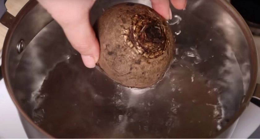3. Охлаждение: Снимите кастрюлю с плиты, вылейте горячую воду и залейте свеклу ледяной водой на 15 минут. Готово!